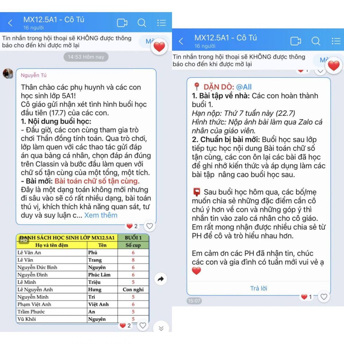 Sau mỗi buổi học, các thầy cô gửi nhận xét cụ thể từng học sinh, gửi bài tập về nhà, đôn đốc sát sao chấm chữa bài tập về nhà đầy đủ.